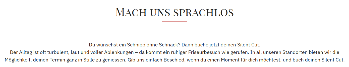 Přeješ si stříhání bez řečí? Pak si zarezervuj svůj Silent Cut. Všední den je často turbulentní, hlasitý a plný rozptýlení – tady přichází klidná návštěva kadeřnictví jako na zavolanou. Ve všech našich pobočkách nabízíme možnost si svou návštěvu užít v tichu. Jednoduše nám dej vědět, že si přeješ chvilku pro sebe, a zamluv si službu Silent Cut.